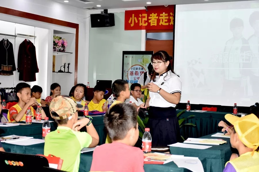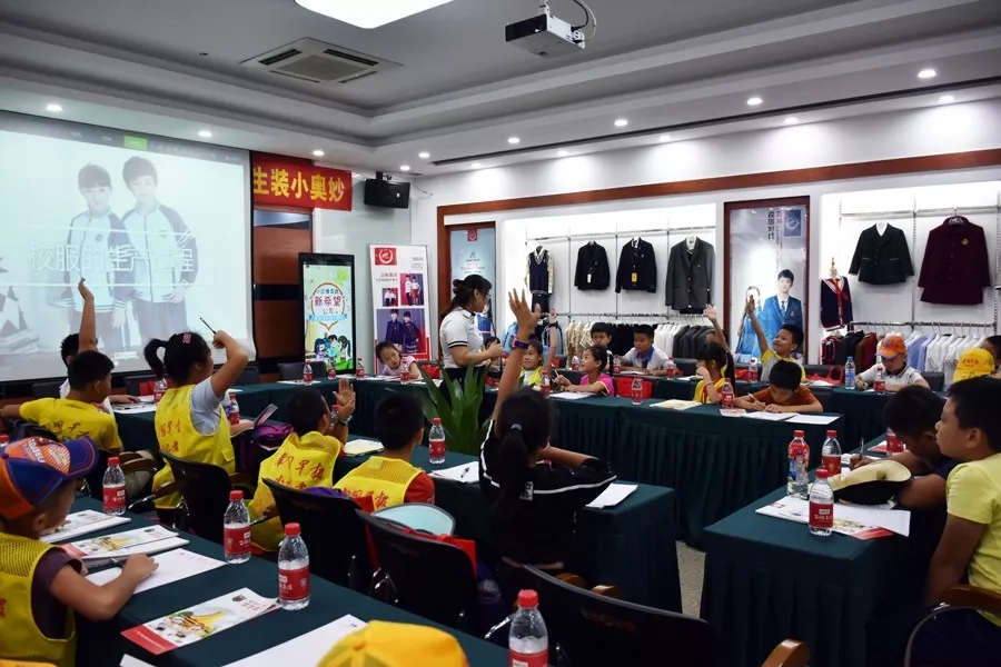 隨后,小記者們來到新希望學(xué)生裝生產(chǎn)企業(yè)百裕集團營銷中心,齊聚服裝展示廳共同深入探討學(xué)生裝知識。會上,小記者們共同觀看了“學(xué)生裝生產(chǎn)流程視頻”,并回顧往年“新希望”學(xué)生裝款式等內(nèi)容。