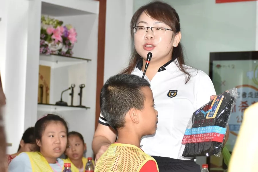 (新希望公司副總經(jīng)理莫麗江經(jīng)理為小記者們講解防偽標(biāo)識)