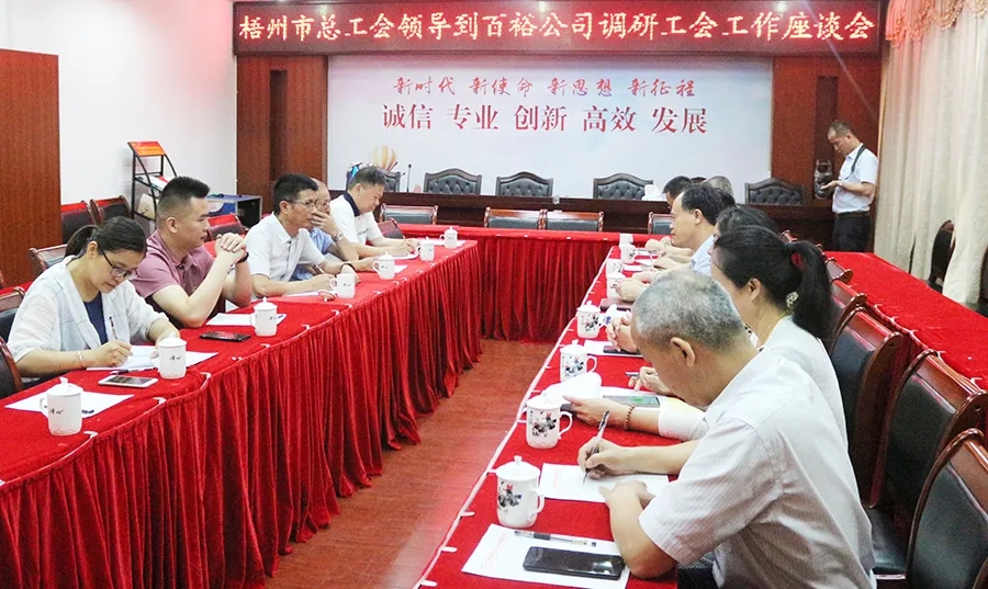 5月18日,梧州市總工會(huì)黨組書(shū)記、常務(wù)副主席謝善高、辦公室主任陳潔萍、勞經(jīng)部部長(zhǎng)呂星等領(lǐng)導(dǎo)蒞臨百裕調(diào)研指導(dǎo),重點(diǎn)了解基層工會(huì)建設(shè)情況、運(yùn)轉(zhuǎn)情況以及勞模創(chuàng)新工作等方面的工作情況。岑溪市人大副主任、工會(huì)主席謝梅、百裕世紀(jì)工會(huì)主席曾晏來(lái)陪同調(diào)研。