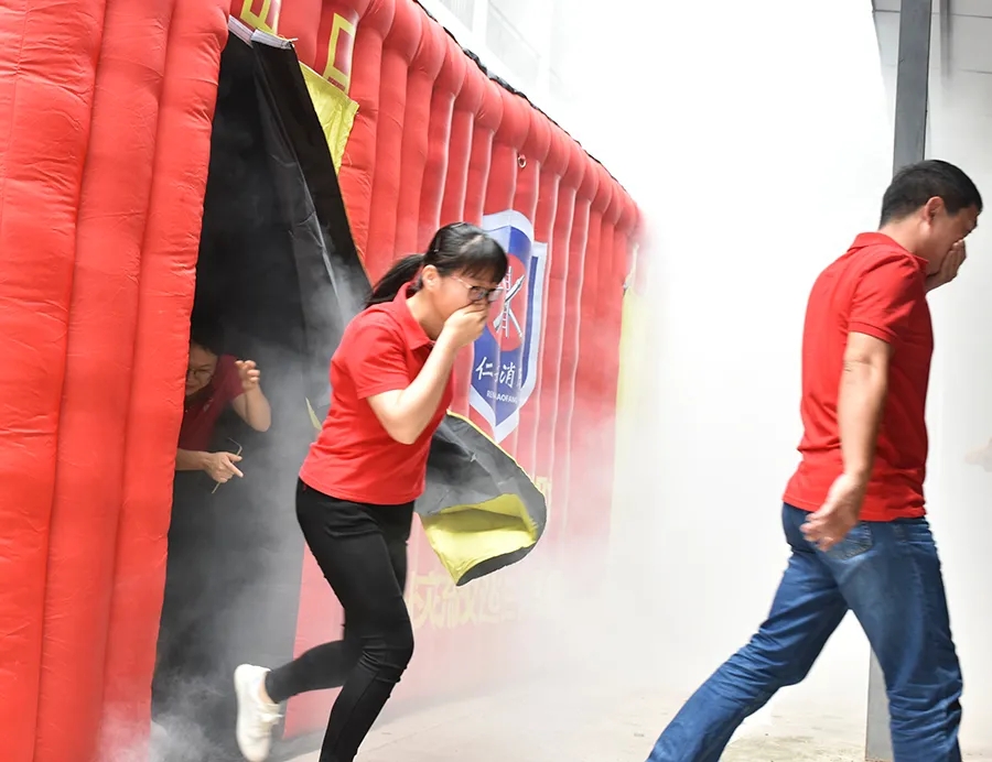 隨后,全體員工進行了濃煙體驗應急逃生和滅火的綜合演練。緊急逃生模擬封閉場館火災情景,全體員工在密閉的環(huán)境下演練正確逃生方法。濃煙體驗小黑屋被遮得嚴嚴實實,冒出陣陣濃煙,參與實訓的員工在徐教官的指導下,捂住口鼻,俯著身,沿著墻面,一一體驗了一把火場逃生的真實場景。