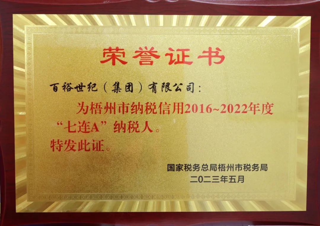 近日,經(jīng)國(guó)家稅務(wù)總局梧州市稅務(wù)局評(píng)審,百裕世紀(jì)(集團(tuán))有限公司被評(píng)為2016~2022年度“七連A”納稅人,這是我們堅(jiān)持依法、誠(chéng)信經(jīng)營(yíng)的實(shí)質(zhì)成果。