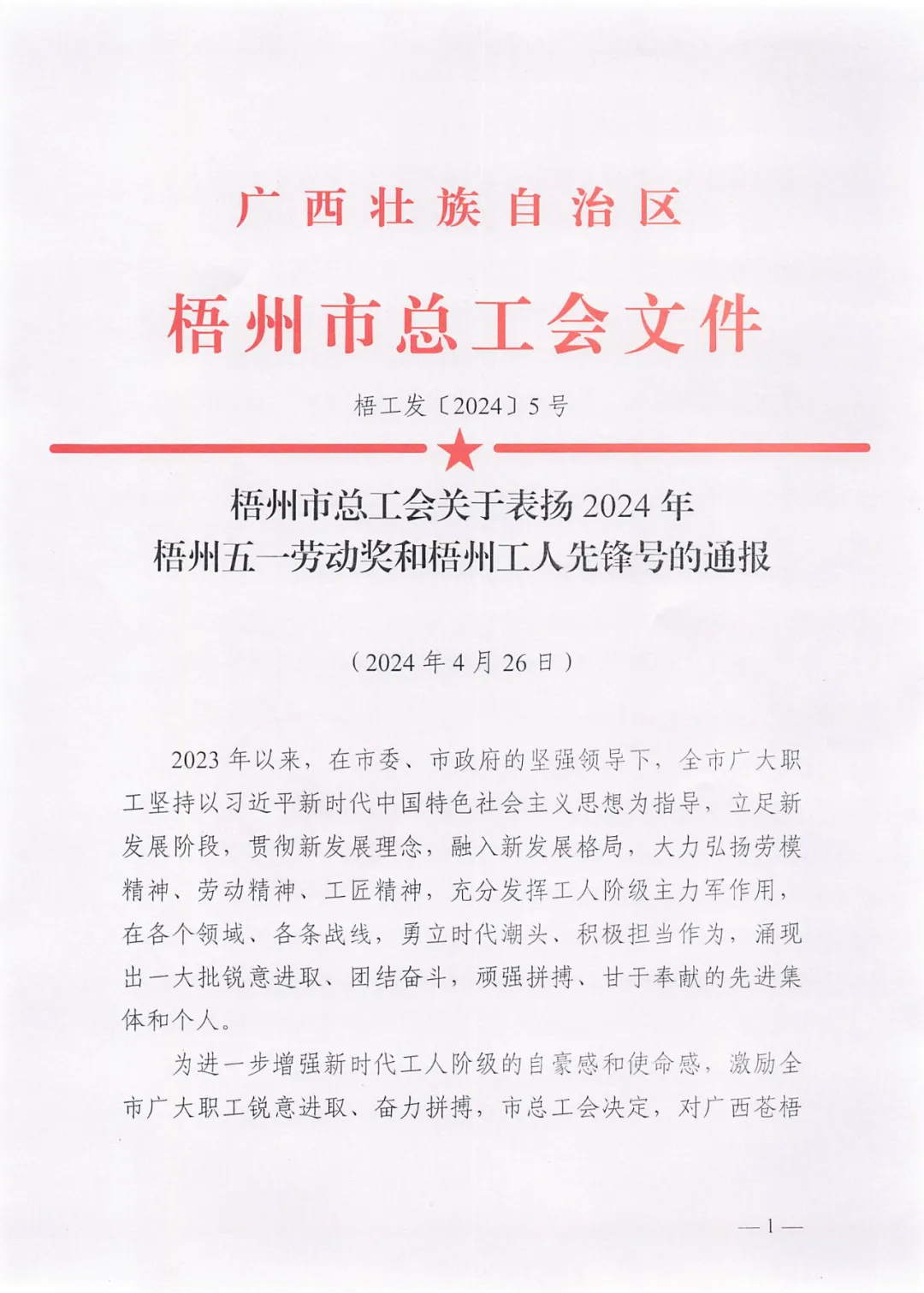 4月26日,梧州市總工會印發(fā)《梧州市總工會關(guān)于表揚2024年梧州五一勞動獎和梧州工人先鋒號的通報》,百裕世紀(集團)有限公司羅獻鳳同志榮獲2024年“梧州五一勞動獎?wù)隆薄?/span>